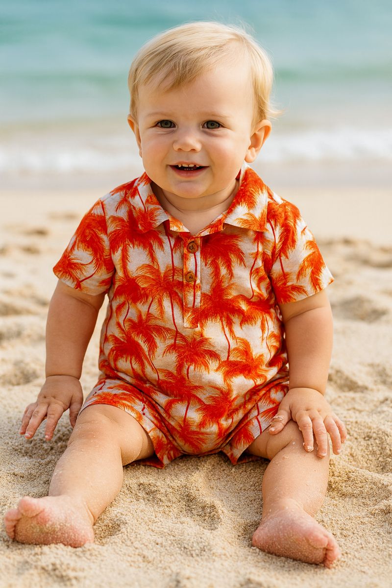 Escape to island vibes with the Molokai Romper in Dusk Palms! This playful printed polo features tropical palm designs that transport your little one straight to paradise. Crafted for comfort and style, it's perfect for warm-weather adventures, casual outings, or making a splash at summer gatherings. The relaxed fit keeps him cool and happy all day long. Let his personality shine with island-inspired flair!