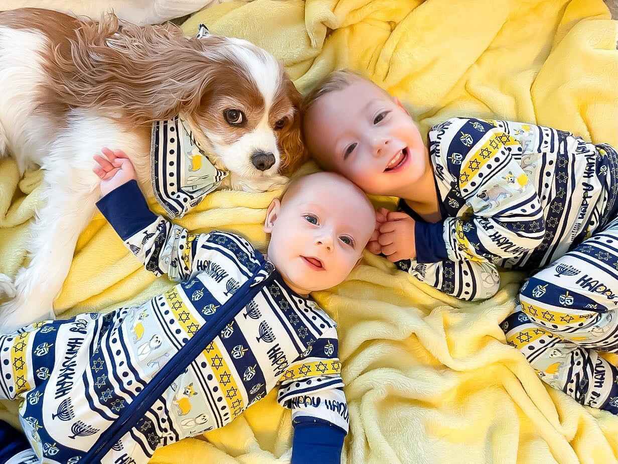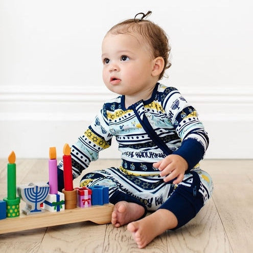 Wishing your family peace and light this holiday season. This festive holiday print in shades of blue and gold, features a Happy Hanukkah message, and the menorah used to celebrate Chanukah. We've added a fun holiday twist with rows of your favorite dog breeds. Who says Hanukkah pajamas all have to look the same?! Featuring our hypoallergenic bamboo viscose fabric in a one-piece sleeper pajamas. Designed with the must have two way zipper, to simplify dressing and diaper changing. We also included easy fold cuffs at the hands and feet, to help protect your babies face and keep little ones of all ages extra snuggly. * Earth-friendly, hypoallergenic bamboo viscose extra gentle on sensitive and eczema-prone skin.