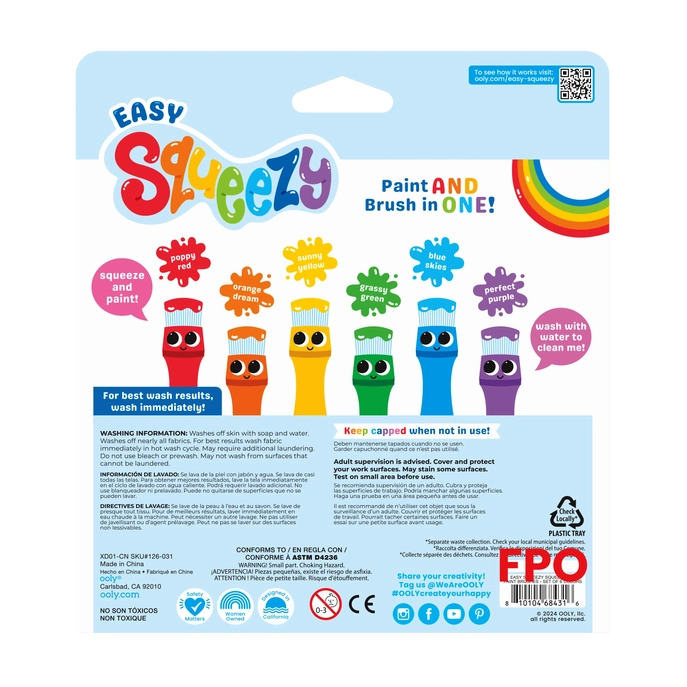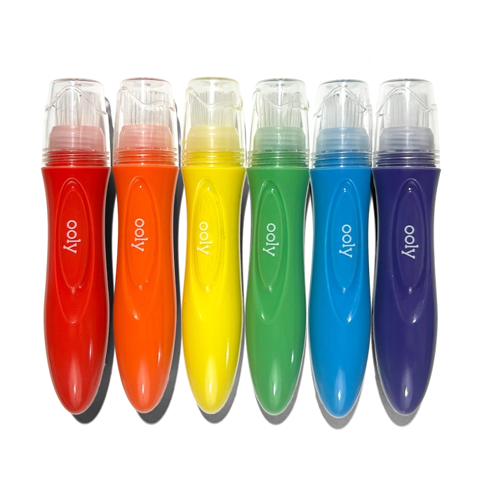 Colors include: red, blue, purple, green, yellow, and orange Keep brushes capped when not in use For best wash results, wash immediatelyย