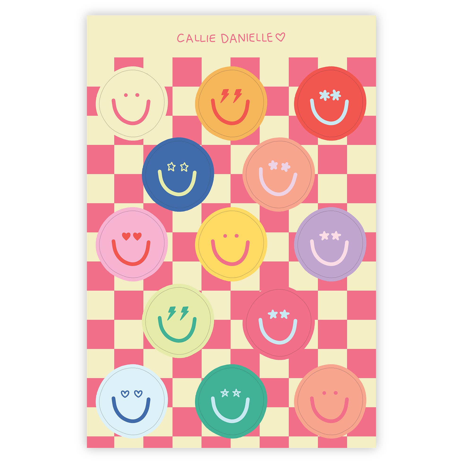 Bright, cheerful, and full of personality! The Smiley Faces Checkerboard Sticker Sheet features a fun mix of colorful smiley faces on a retro checkerboard background. Perfect for decorating notebooks, planners, water bottles, laptops, and classroom supplies. Add a pop of happiness to your day!