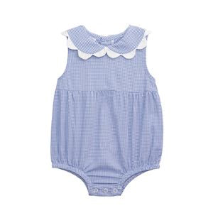 Gingham sleeveless bubble features Peter Pan collar with scallop poplin trim. Inner leg snaps.