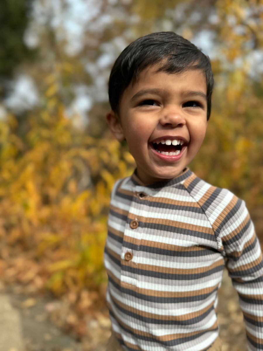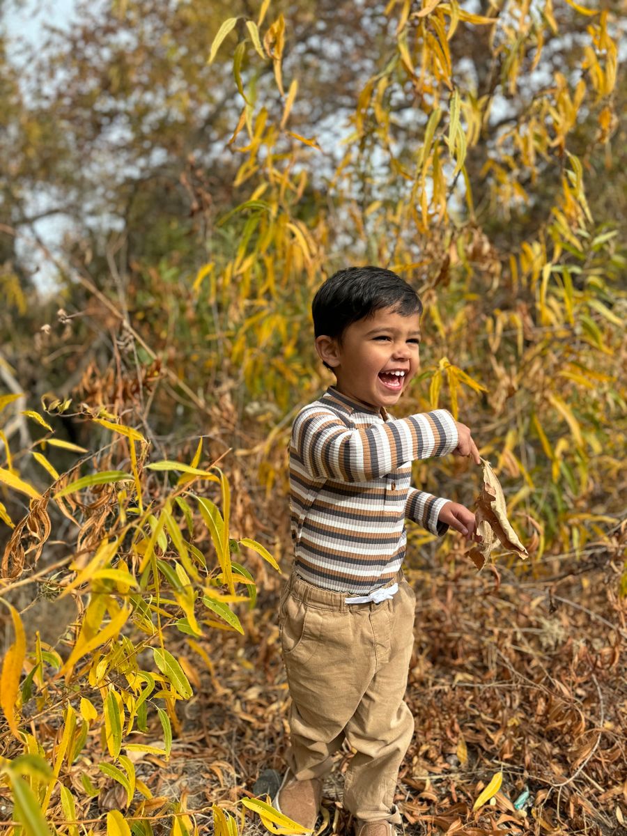 This super soft raglan striped onesie in beige and olive with elbow patches will look super cute with overalls or just about anything!