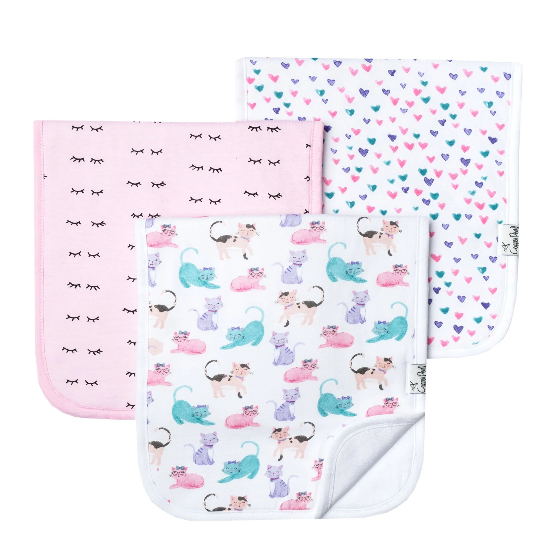 - burp cloths are designed with baby’s comfort in mind. That’s why we created them with 100% ultra-soft cotton layers on the front (patterned) and back (plain white). You can feel confident that baby will feel cozy against your shoulder while burping.