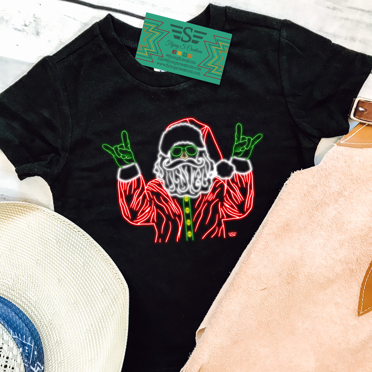 This tee is super fun for the holidays! Rocker Santa is my kind of Santa! This tee is an absolute must in your holiday outfit line up! Printed in house on our LAT brand tees! This is an exclusive design of Flying S! all designs are copyright of Flying S Company.