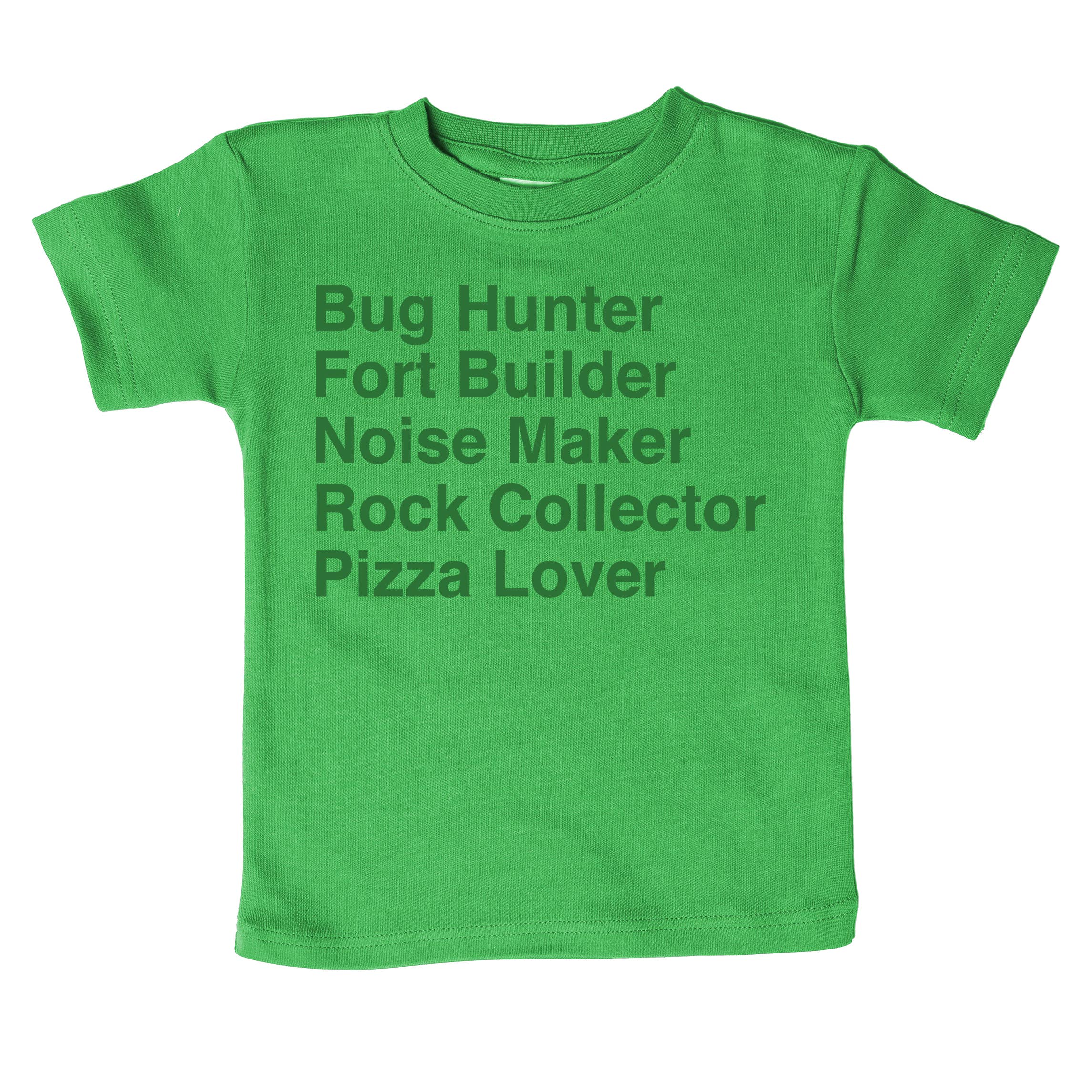 If you have a dinosaur huntin', fort buildin', noise makin', rock collectin' pizza lover on your hands... this tee's for you! Designed and printed in the USA. Made with 100% certified organic cotton.