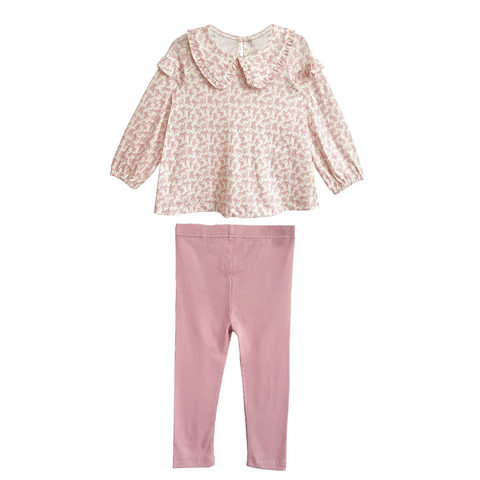 This precious outfit begins with a mustard block print ruffle collar blouse and layered with a denim overall dress.
