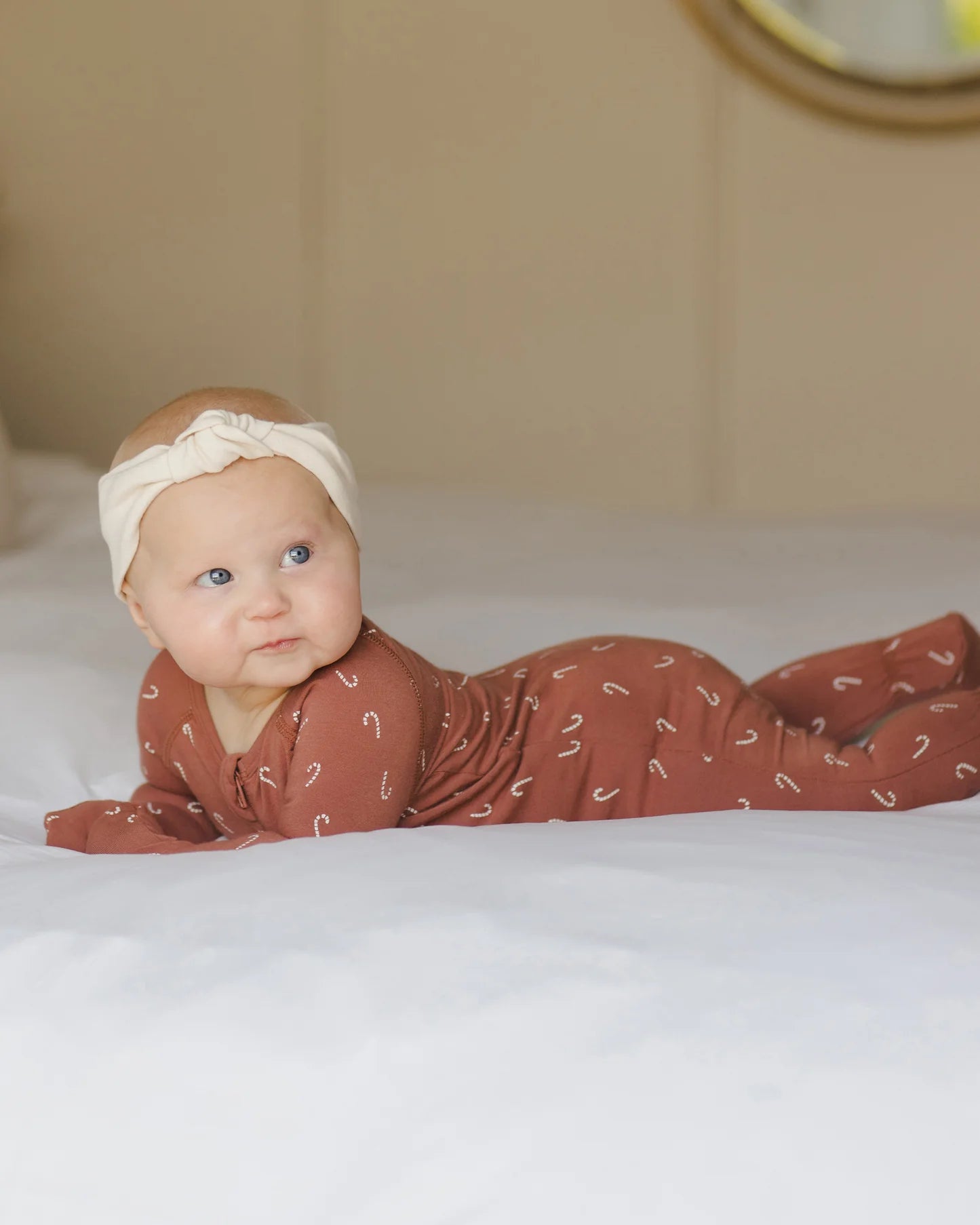 Full double-zip footie crafted from our soft and stretchy bamboo fabric. Fold-over hand mitts included on sizes NB – 3-6M. Raised screen print on soles of size 6-12M for added traction.